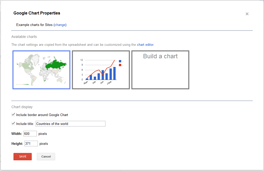 Once you select a spreadsheet, the editor picks existing charts from the spreadsheet to embed into a Site.